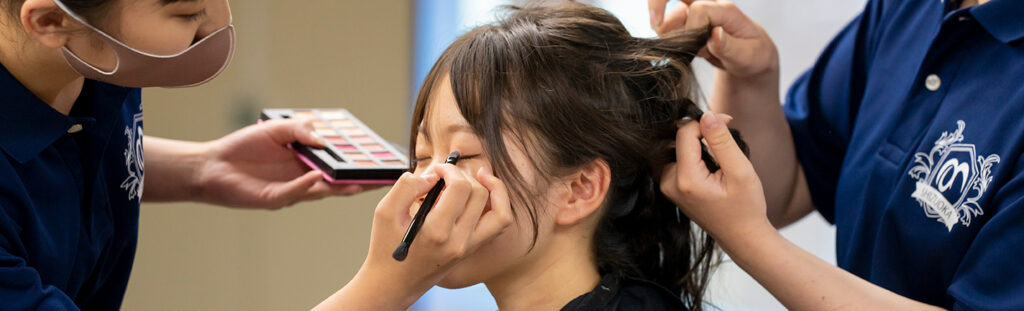 美容コースでは、年2回、美容ショーを開催し、学んだ技術を発表できる場を設けています。ヘアアレンジ、ネイル、メイクなどは、生徒たち自身が考え、当日はステージ上で披露します。夏(7月)と冬(11月)のオープンスクールにあわせて開催しますので、是非、ご来校ください。
